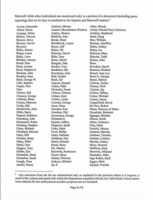 U.S. Attorney General Pam Bondi and Deputy AG Todd Blanche just submitted to Congress a full accounting of redactions made and a list of every government official and “politically exposed person” named in the Epstein Files under Section 3 of the Epstein Files Transparency Act: