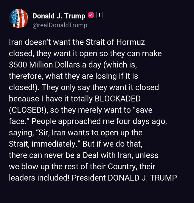 The president wrote on Truth Social that Iran did not want their crucial oil passway, the Strait of Hormuz, to be closed, claiming the country only shut the Strait to “save face” after the U.S. blockaded it.