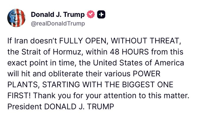 President Donald Trump has threatened to “obliterate” Iran’s power plants if the country does not fully reopen the Strait of Hormuz within 48 hours. “If Iran doesn’t FULLY OPEN, WITHOUT THREAT, the Strait of Hormuz, within 48 HOURS from this exact point in time, the United States of America will hit and obliterate their various POWER PLANTS, STARTING WITH THE BIGGEST ONE FIRST!” Trump wrote on Truth Social.